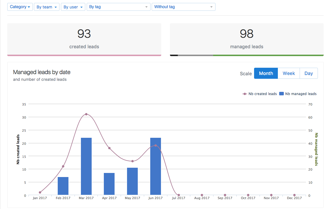 Dank verschiedener Kategorien welche Sie in dem Admin Bereich > Leads Kategorisieren in Ihrem Account erstellt habe, können Sie einen besseren Überblick über Ihr Business bekommen: welches Produkt mehr verkauft wird, an welche Kunden, wo Ihre Kunden sind, welche Marketing Aktionen am besten funktionieren etc...