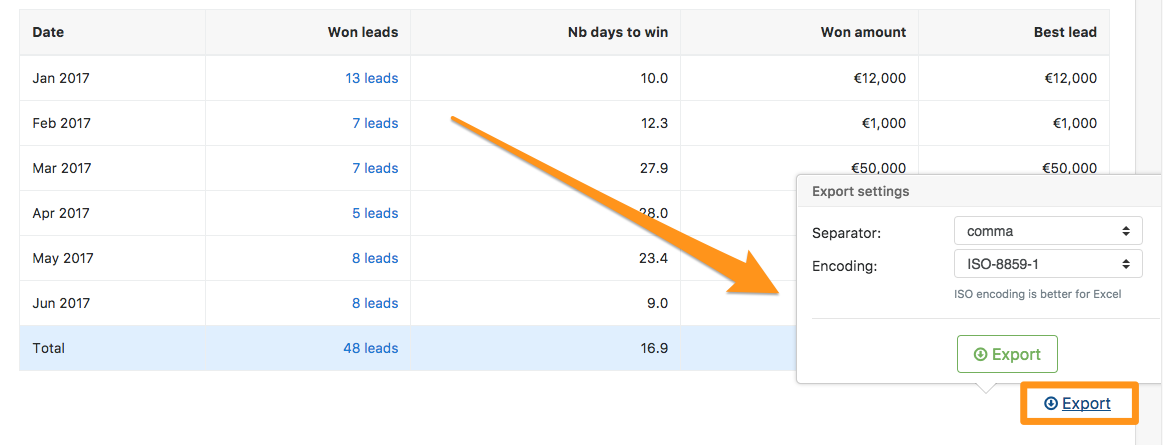 Für Berichtszwecke, müssen Sie eventuell Ihre Statistiken exportieren. Es kann die einer bestimmten Person, eines bestimmtes Monat, Event, Produkt oder Service sein.