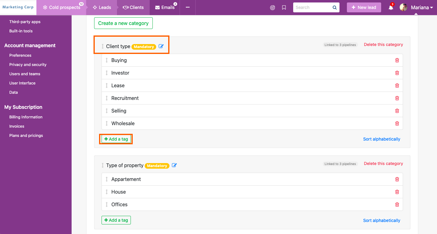 Para crear categorías y etiquetas, ve al Panel de administración > Proceso de ventas > Categoriza tus leads