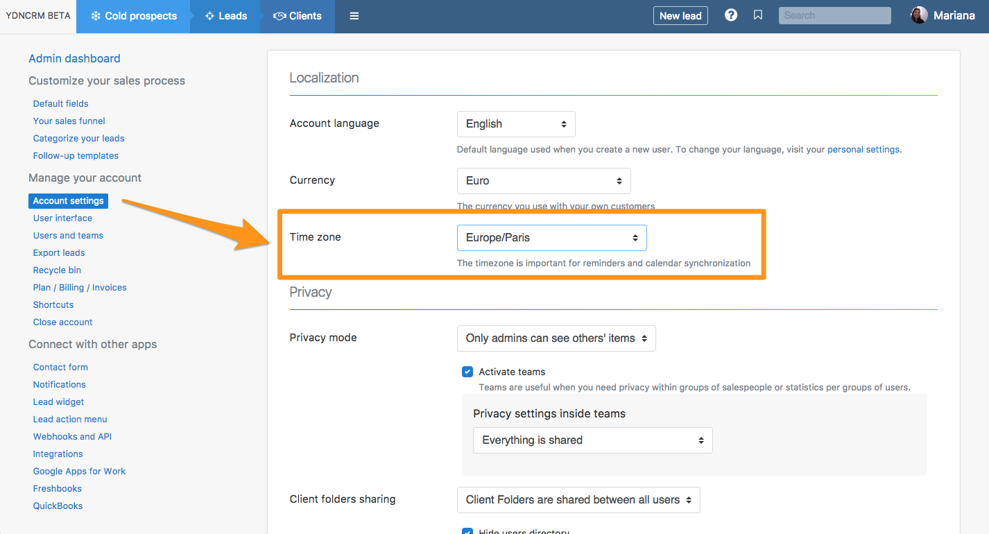 Puedes definir tu Zona Horaria en Admin > Preferencias de la cuenta.