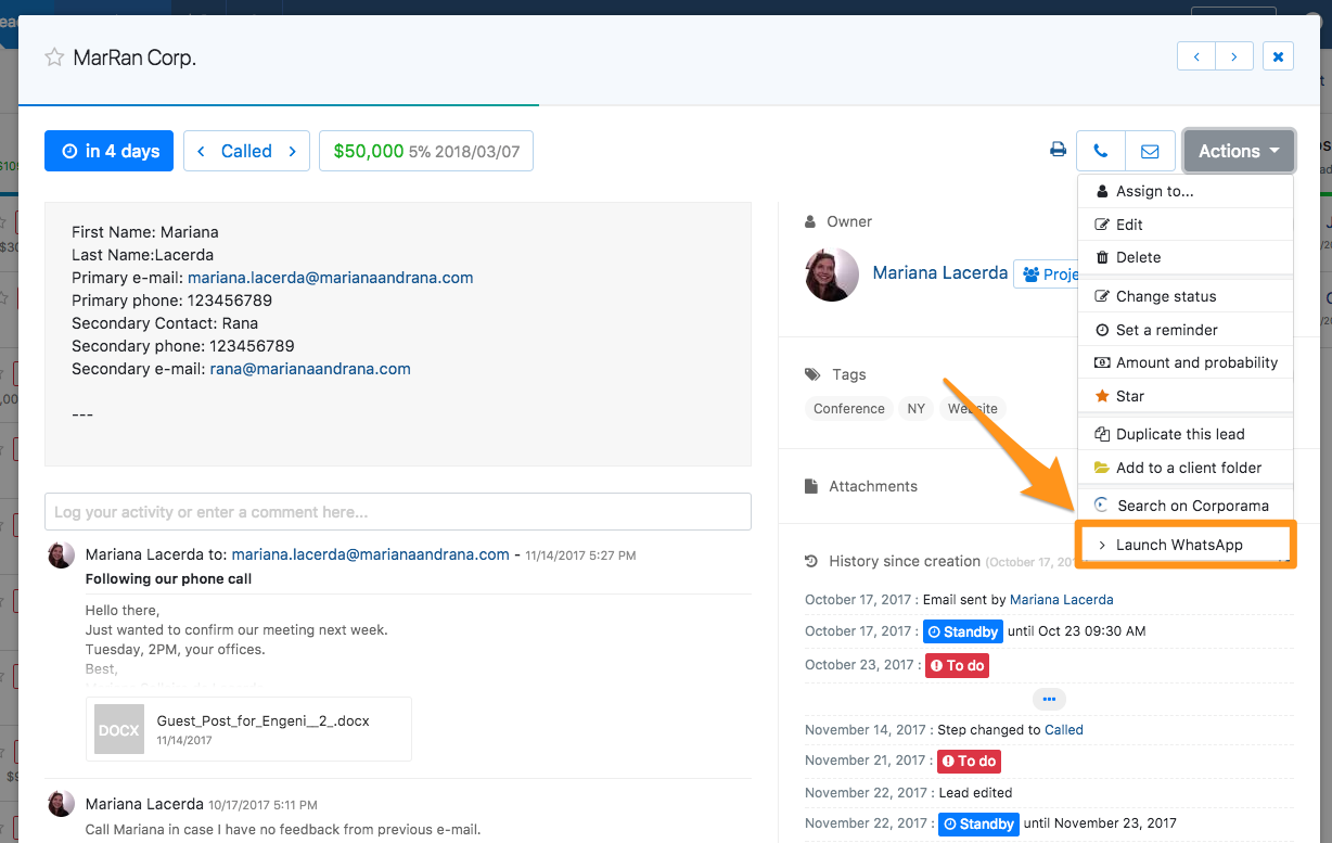 Grâce au Menu d'Actions de l'opportunités de no CRM.io, vous pourrez lancez WhatsApp Web en un click pour envoyer un message à un potentiel client.