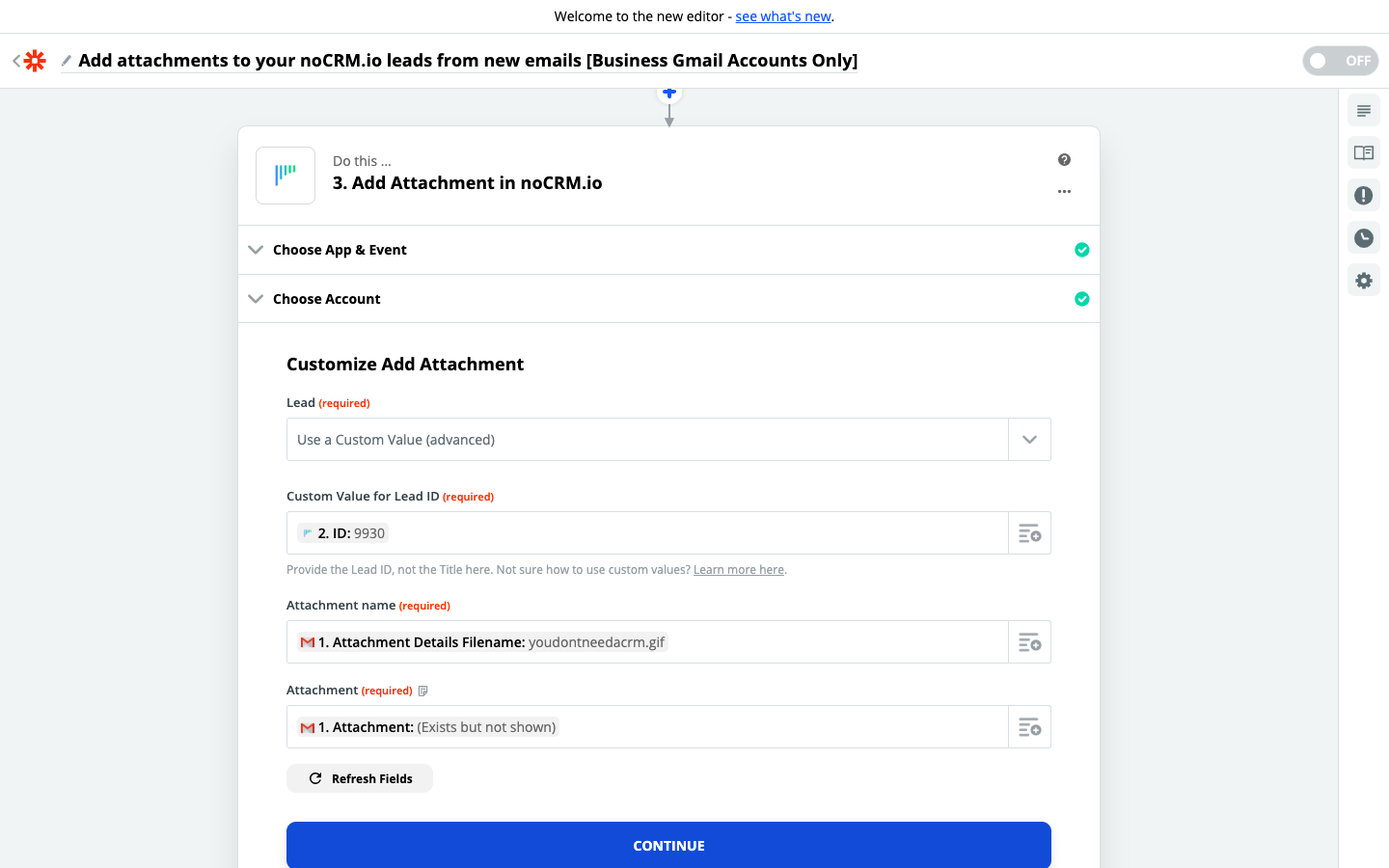 - - Selon les détails que Zapier a récupéré de l'annexe Gmail, sélectionnez le nom de l'annexe et le document annexé.
