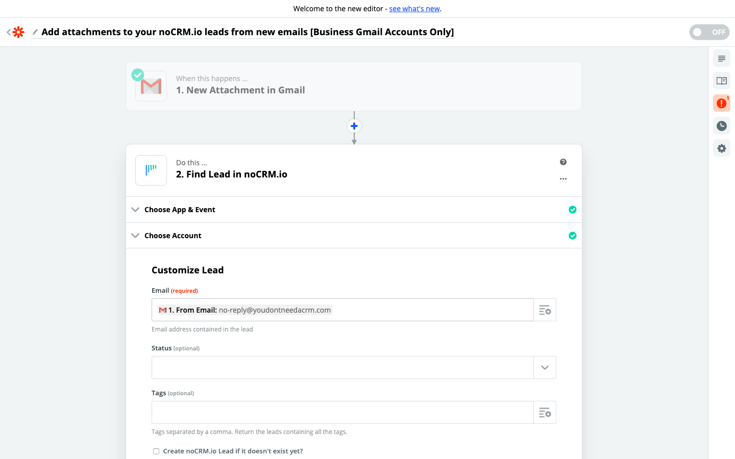 - - Selon l'annexe de l'email que Zapier a récupéré de Gmail dans l'étape précédente, sélectionnez l'e-mail de l'émetteur.