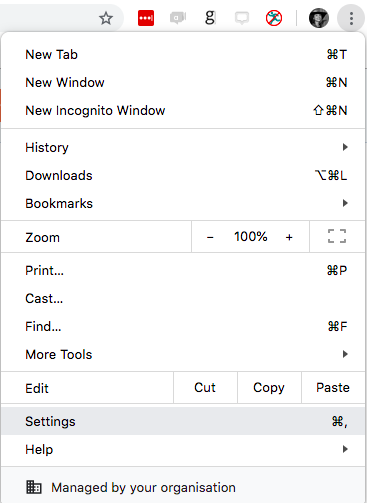 1/ Si vous ne voyez pas l'icône du Gestionnaire de protocole , cliquez sur l'icône du menu Chrome dans le coin supérieur droit de votre navigateur, puis choisissez Paramètres.