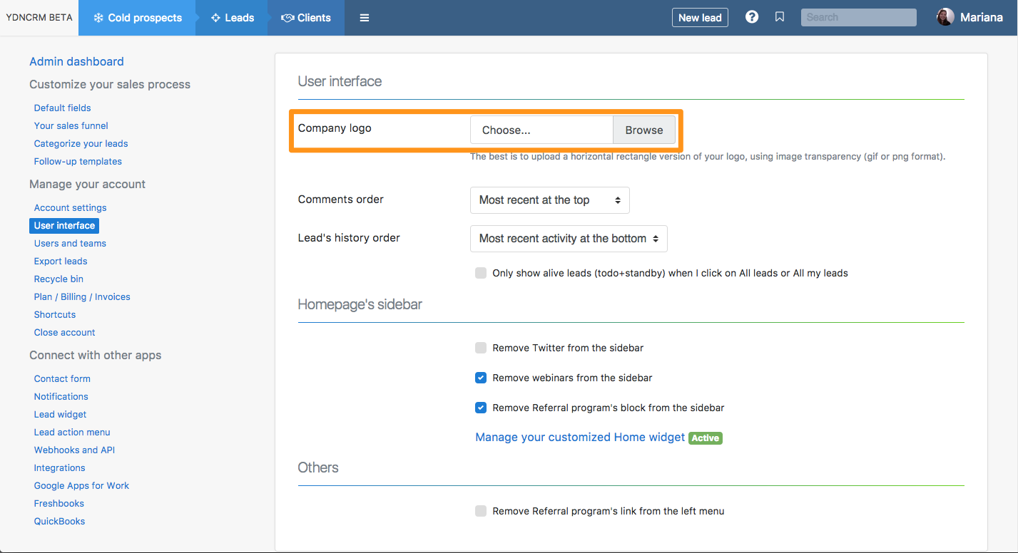 Pour ce faire, aller dans Panneau d'administration > Gestion du compte > Interface. Lorsque vous ajoutez votre logo, il remplace celui de no crm.io en haut à gauche.