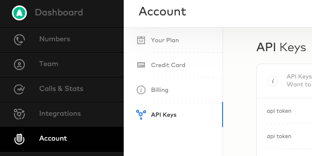 Récupérer votre clé API Rentrez dans votre compte Aircall, allez dans la page Company et choisissez API Keys. Une fois là-bas, cliquez sur + Add an API key, où vous trouverez votre API ID et Token. Vérifiez que votre ID et Token sont gardés quelque part pour que vous ne les perdiez pas.