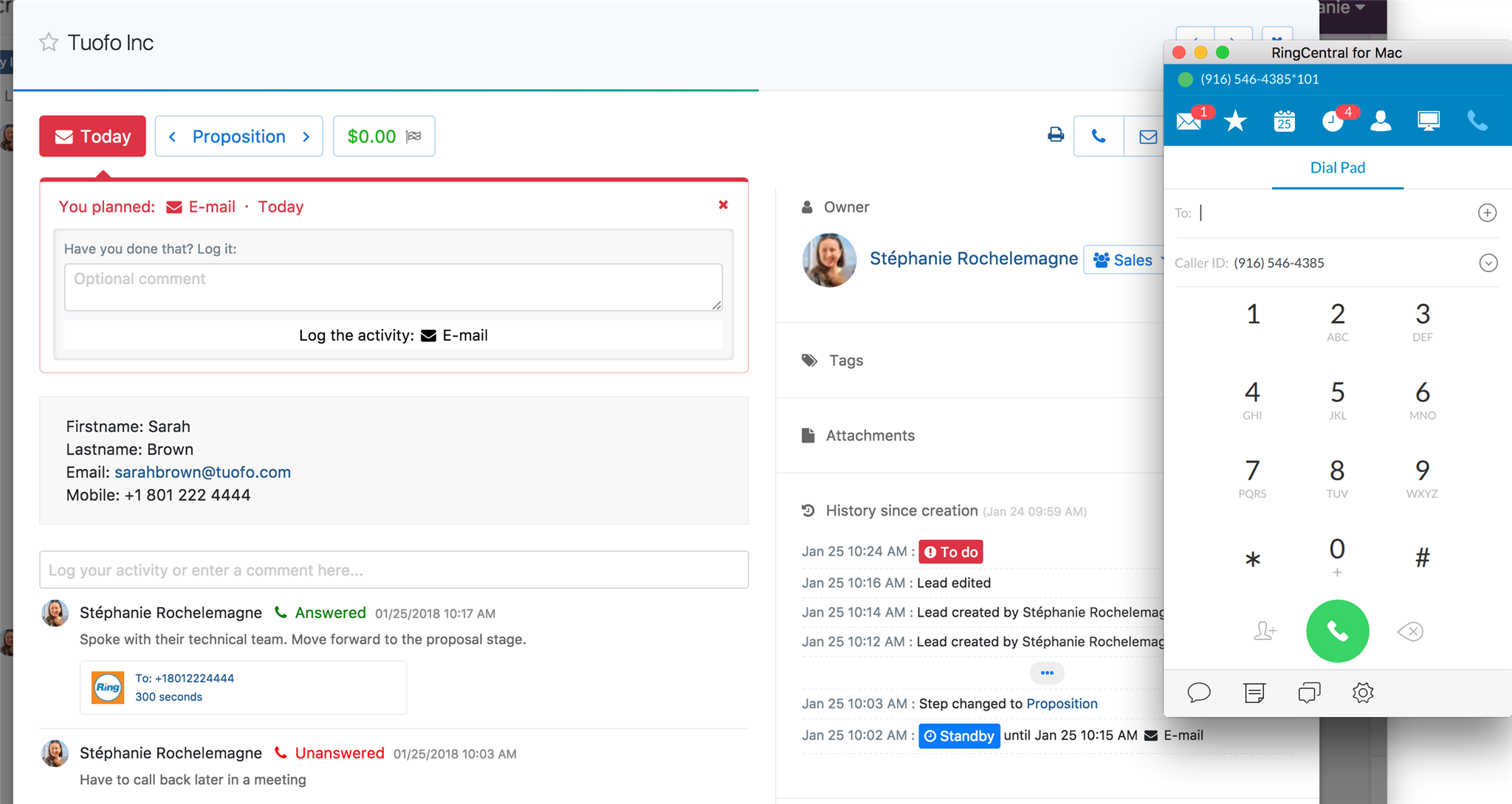 RingCentral est une solution cloud de communications pour les entreprises. En connectant RingCentral à propipelines.com, vous permettez à vos utilisateurs d'appeler leurs opportunités directement depuis Pro Pipe Lines et d'enregistrer automatiquement leurs activités téléphoniques. Cette intégration est limitée à RingCentral voice calls.