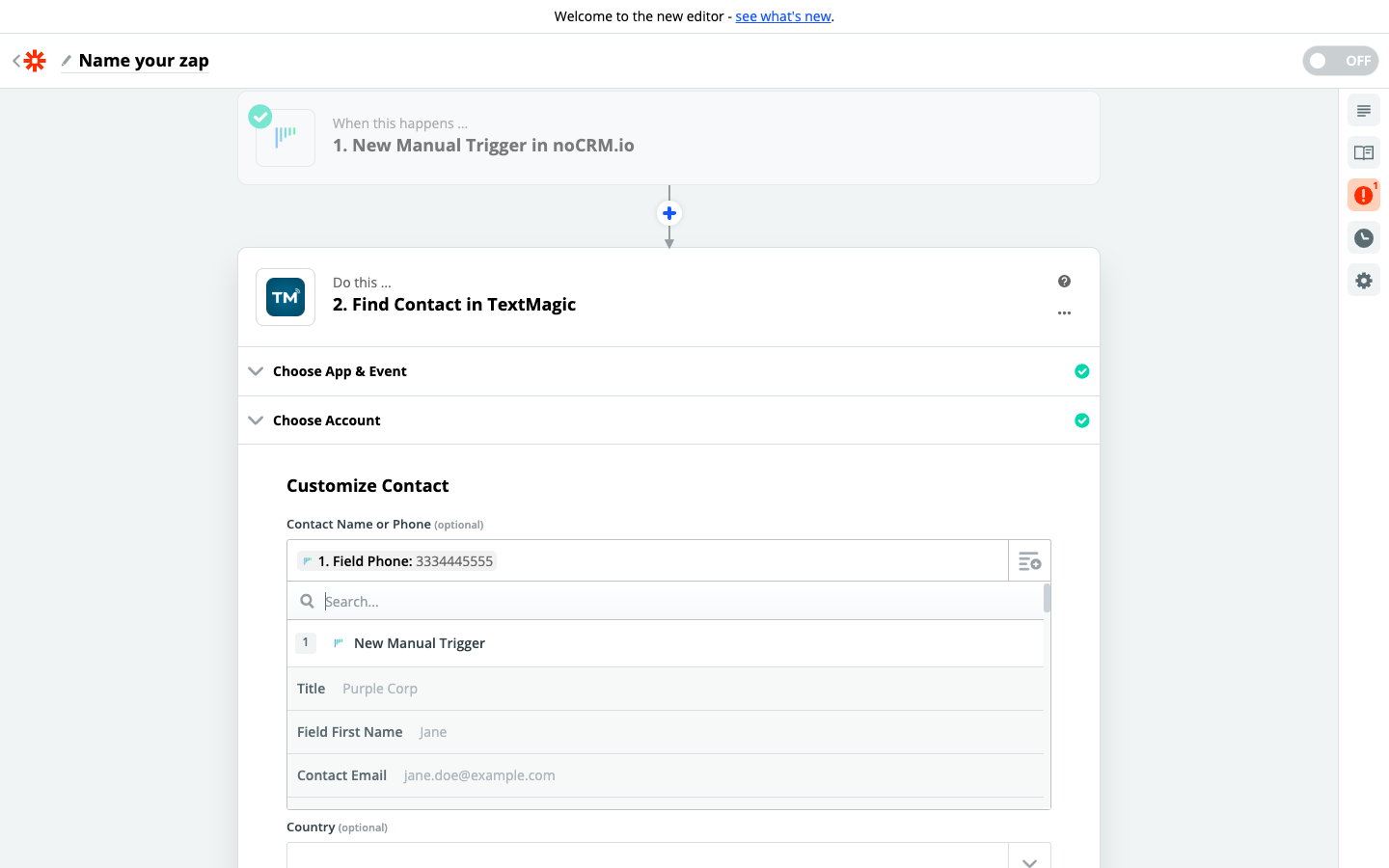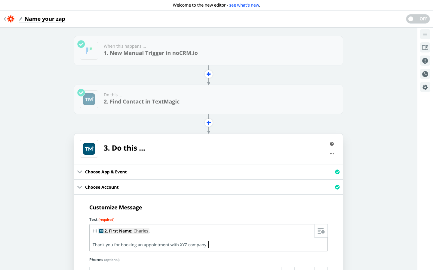 Vous avez simplement besoins de créer des comptes sur TextMagic, no CRM.io, et Zapier.