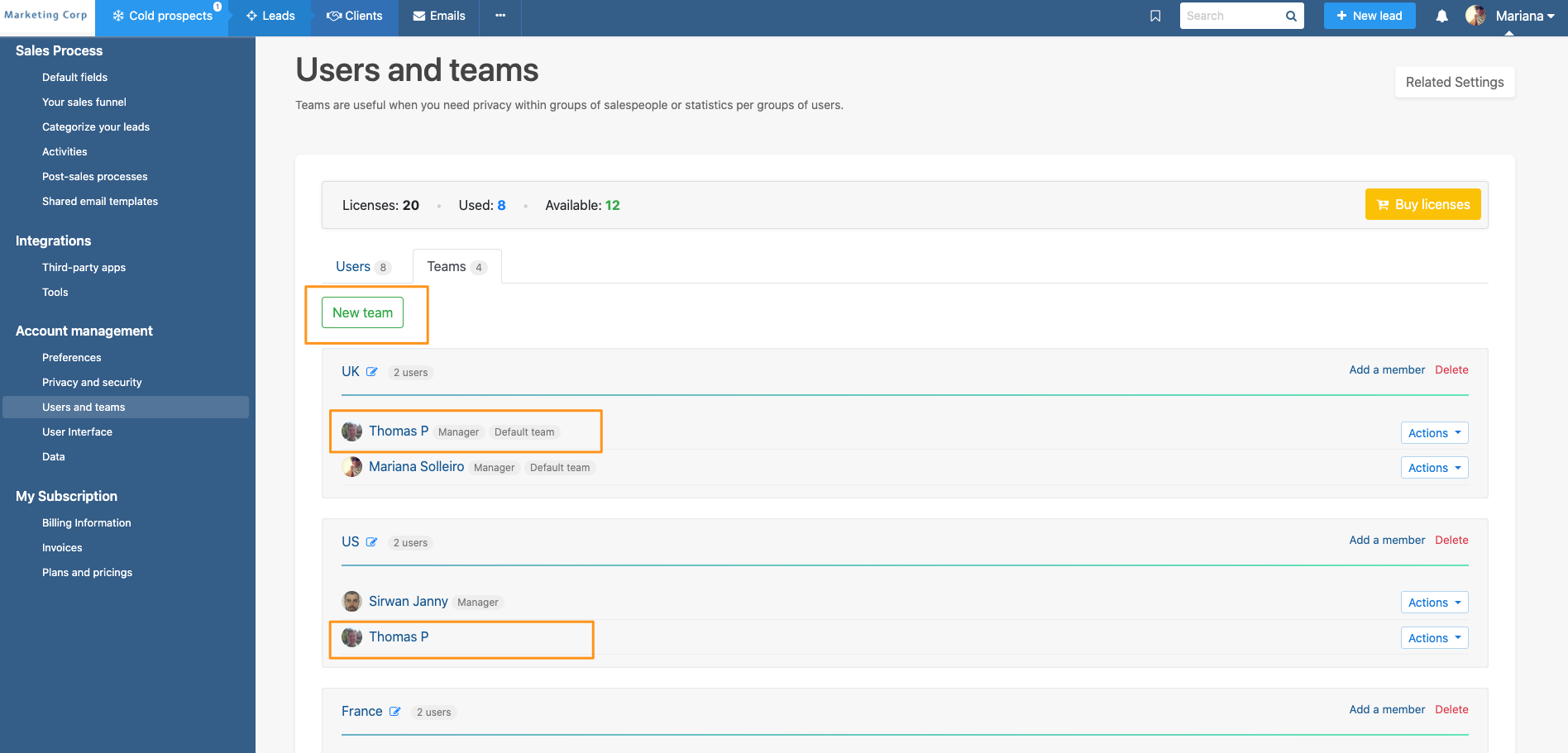 Una volta attivata la funzionalità, il menù “Utenti” nel Pannello di controllo diventa “Utenti e team”. Accedi. Ora c'è una nuova scheda “Team” che ti permette di creare il primo team. Una volta creato il team puoi assegnargli utenti e scegliere un manager di team per ciascuno. In base alla modalità di privacy che hai scelta, i manager dei team possono accedere e modificare le opportunità commerciali degli altri utenti ed accedere alle loro statistiche.