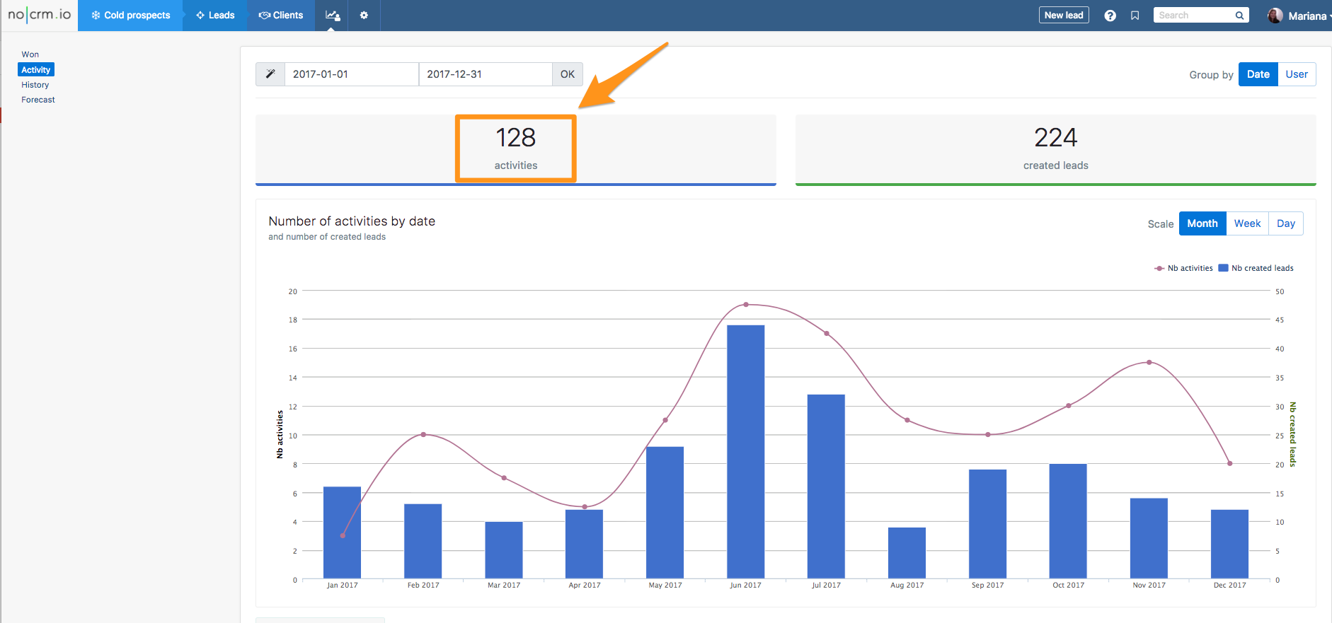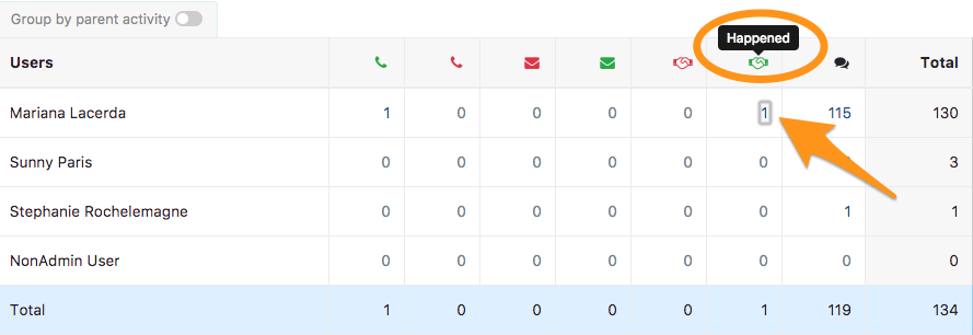 Entre nas Estatísticas da sua conta, clique em "Atividades" e verá então o total das ações realizadas e planejadas para o período de tempo escolhido