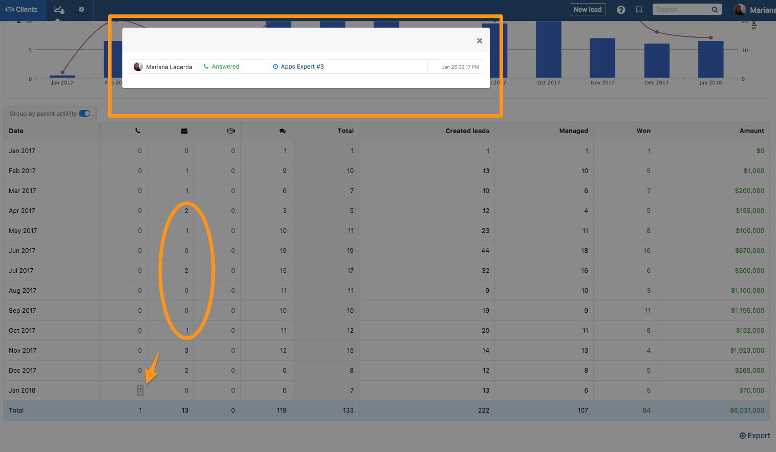 E abaixo do gráfico terá um quadro com ainda mais informação: poderá ver que tipo de ação foi realizada, ou até os resultados por cada tipo de ação.