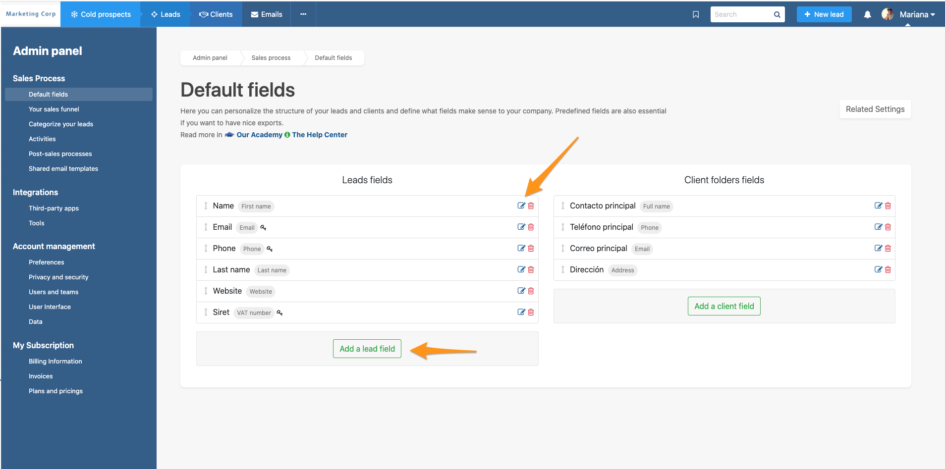 Para predefinir os campos dos leads, dirija-se a Admin > Processo de vendas > Campos do lead.